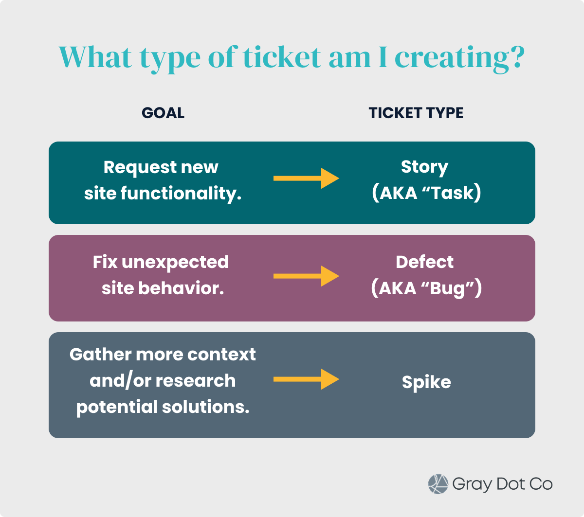 In general, every org uses different ticket types for new work, fixing existing work, and research. However, the name could vary: a “story” at one business might be called a “feature request” at another — or a “defect” could be called a “bug” ticket.